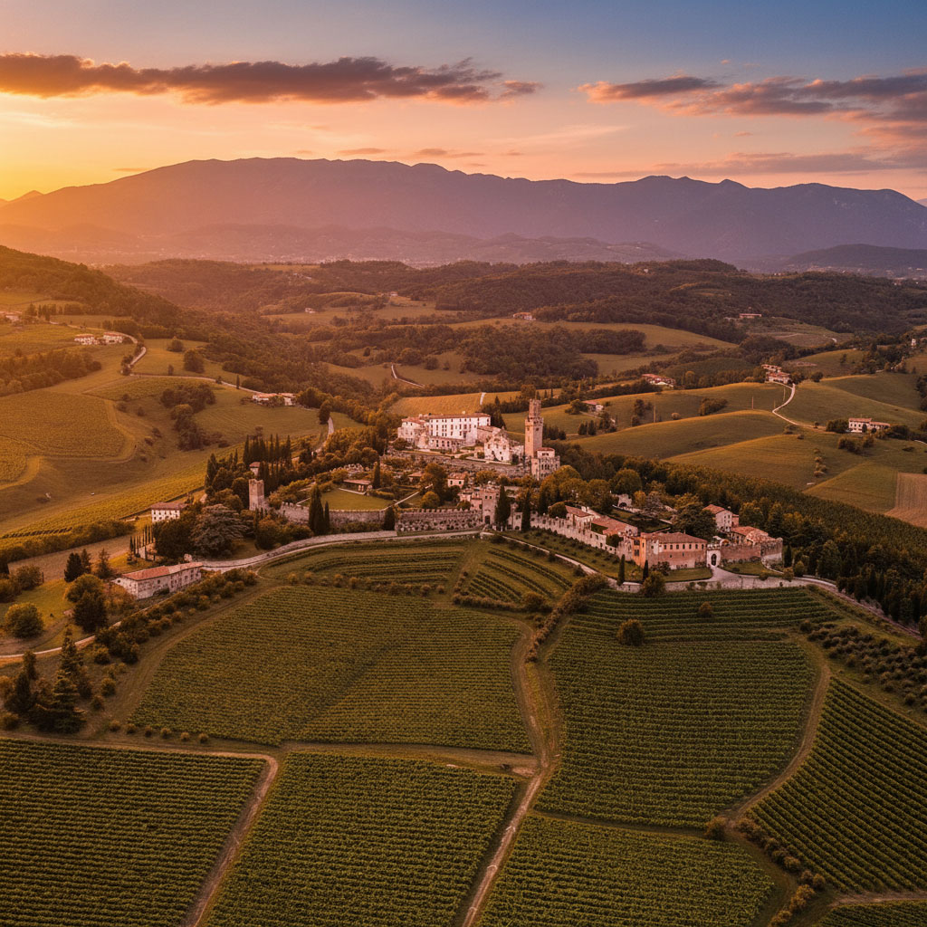 Il Castello San Salvatore sorge nel cuore delle colline del Prosecco, un paesaggio riconosciuto Patrimonio dell’Umanità UNESCO per la sua straordinaria armonia tra natura e opera dell’uomo. Attorno alla rocca, lo sguardo abbraccia vigneti ordinati e scorci collinari, attraversati da luci che si trasformano con il passare delle stagioni.